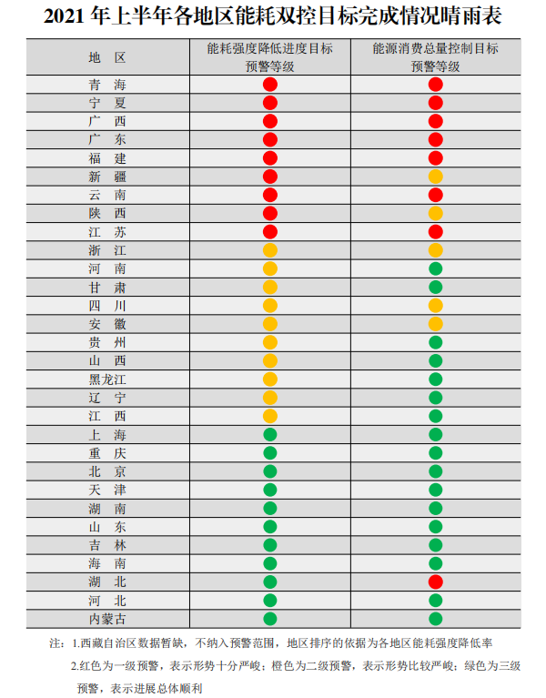 近日,國家發改委在例行新聞發布會上對9個省區直接點名:青海、寧夏、廣西、廣東、福建、新疆、云南、陜西、江蘇9地上半年能耗強度同比不降反升!此外,還有10個省份的能耗強度降低率未達到進度要求,全國節能形勢十分嚴峻。根據發改委印發《2021年上半年各地區能耗雙控目標完成情況晴雨表》可知,廣東、福建、云南、江蘇、浙江、安徽、四川等12個地區在能耗降低和能源消費總量方面均呈現嚴峻態勢,這意味著有一半以上的省份上半年“雙控”目標未能完成。